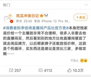 同时,微博出现了另外一种声音,有网友直言:不如李佳琦把佣金“吐”出来给粉丝补一补。如果按照其他直播间曾经公布的信息推测——李佳琦直播间理论上也有坑位费和提成,李佳琦直播间是一个中间商,通俗地讲就是“二道贩子”,羊毛出在羊身上,当然是从李佳琦粉丝身上薅。现在因为其体量比较大,所以一定程度上实现了垄断,有了一定的话语权。有网友建议,真的想买最便宜的不如别看李佳琦,实现品牌到消费者0佣金0抽成,才是真正的便宜。找李佳琦不过是“堂下何人状告本官”!