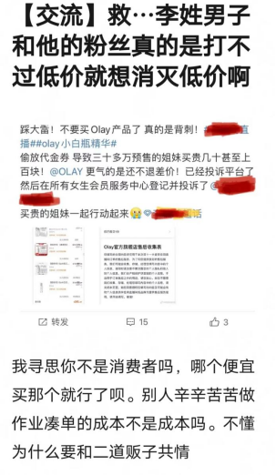 整个微博话题中洋溢着快乐的气氛:一部分李佳琦的粉丝要求资深堂和OLAY退差价,自认为李佳琦直播间就是最低价;另一部分李佳琦粉丝则说李佳琦从未说过自己最低价,反证了要求退钱的粉丝确实是羊毛,有点活该被薅的意味。两者互相矛盾,但唯一的共同点是辱骂普通路人网友,不得不说是很难得的“互联网奇观”。有网友建议李佳琦粉丝:这些价格问题不如去老娘舅等调节节目报名吧,看着都是些很有镜头表现力的人啊!