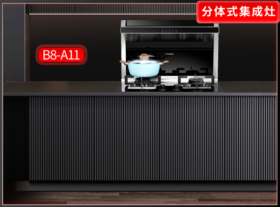 美多B8-A11分体式集成灶模块式设计,不用切割台面、不破坏整体橱柜,将吸油烟机、燃气灶、头部超宽置物台完美地结合为一体,其独特的组合式和18m3/min侧吸下排油烟+5.0kw大火力设计,实现了各项功能的最大化使用效率,非常适合老厨房升级的改造,还省去上方传统壁挂式吸油烟机的吸烟腔空间,上面的位置可以做吊柜来增加储物,让厨房更好用的同时也更加美观、大气!