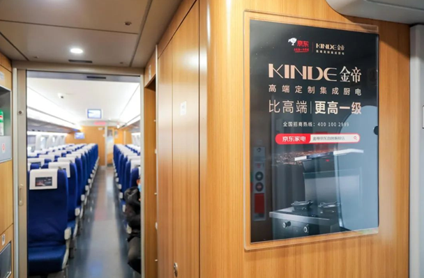 以定制建立高端品牌认知,金帝从产品、设计、服务、形象等多个维度入手赋予品牌差异化优势,来构建企业核心竞争力。此番冠名的高铁专列将金帝全新品牌元素融入了每个细节,从外部车身醒目亮眼的品牌名到高铁内部空间的行李架、座椅、车门附近的广告牌全方位覆盖,在候车、乘车等封闭式环境下多次触达客户群,为品牌营销渗透提供强大支撑力。