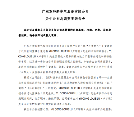 11月10日下午,万和电气发布公告,公司董事长兼总裁卢宇聪辞去总裁职务,聘任赖育文为公司总裁,全面负责公司的整体经营管理,任期自本次董事会审议通过之日起至第五届董事会届满时止。