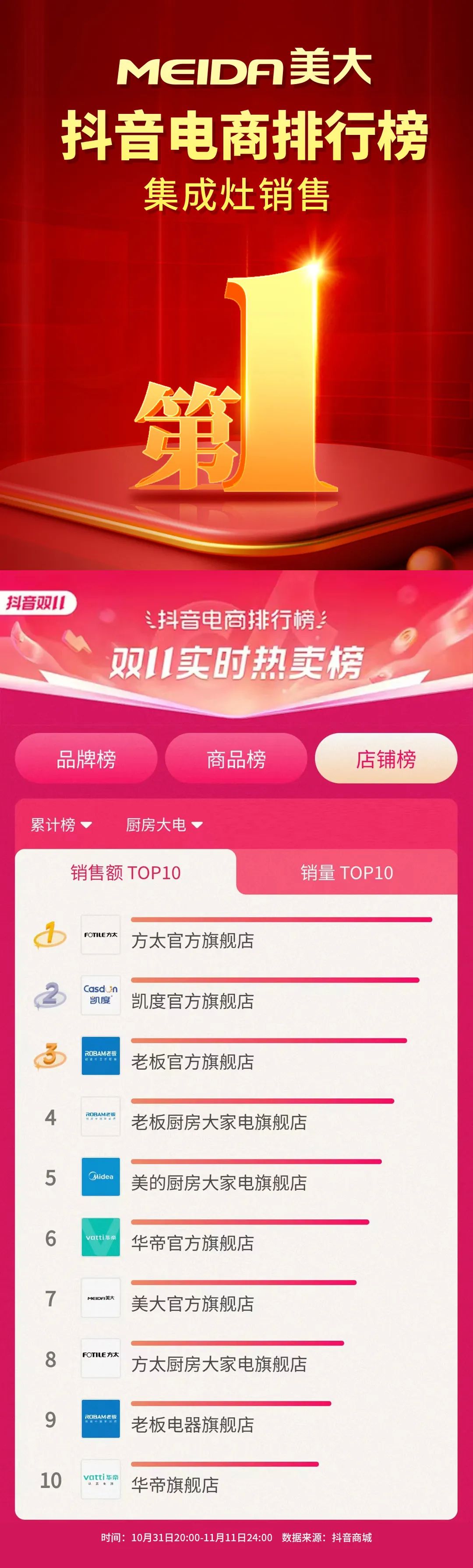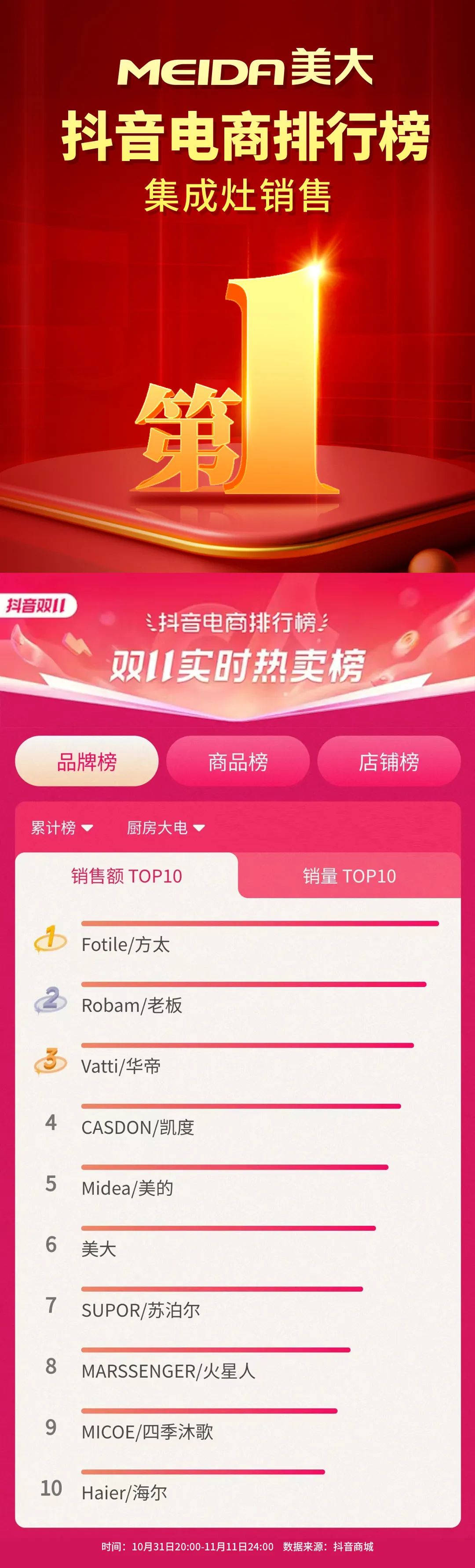 浙江美大顺应直播电商趋势,提前布局直播电商,不断完善直播运营,美大集成灶官方抖音直播成为抖音商城厨房大电品类的中坚力量。2022年双11,美大集成灶在抖音商城集成灶品类销售拔得头筹,霸榜抖音电商品牌榜、商品榜,既是美大集成灶品牌实力的展现,也是直播电商付出的回报。