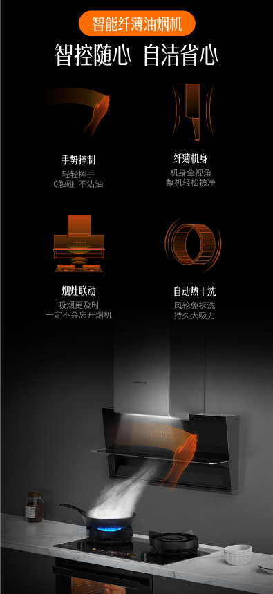 烹饪并享受美食过后,最怕面对满屋油腻难清洁。亿田烹饪中心全新智能纤薄油烟机,打破传统油烟机的笨重繁琐。智能感应式面板,轻轻挥手即可自由操作,0触碰,不沾油;纤薄机身,轻松周转即可擦净;烟灶联动,不放过任何一丝油烟;更有自动热干洗等功能,风轮无需外拆清洗,寿命更持久,吸力更稳定!