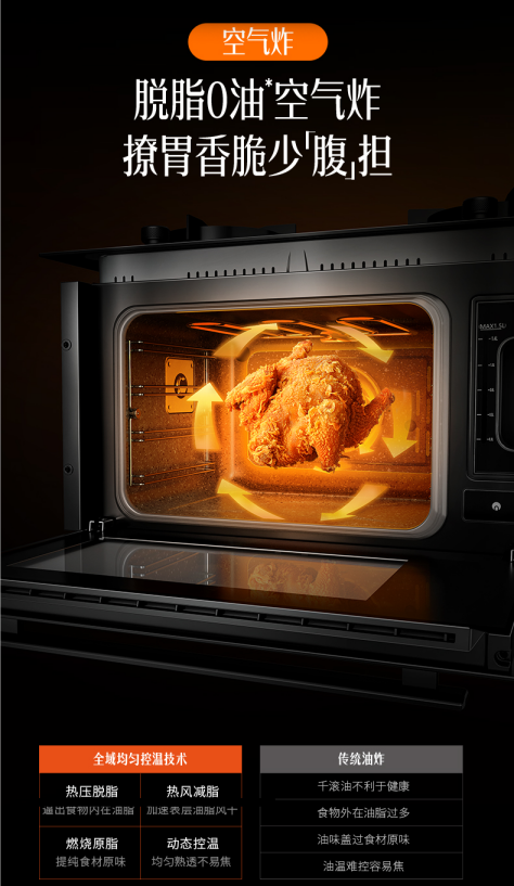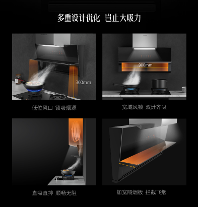 亿田排烟技术再登新台阶!亿田P3ZK集成烹饪中心,采用多重集成智能设计,爆炒达到22m3/min大吸力,风口与炉灶之间仅为300mm,近距离低位风口,锁吸烟源;同时,P3ZK外置890mm超宽域吸烟风道,双灶齐吸,牢牢锁住油烟;加宽隔烟板,拦截飞烟;直吸直排,顺畅无阻,解决烟气笼罩问题,油烟去无踪!