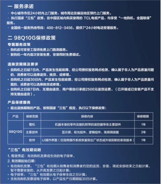 在售后服务方面,TCL不仅提供全天候7x24小时人工服务热线、上门安装调试及维修服务,并顺应“互联网+”发展模式,在互联网端开通服务平台,可以随时随地查看服务进度、家电保养常识和常见问题等;并对旗下所有电视产品售后服务进行全面升级,即用户新购机7天内发生性能故障,用户可选择退机、换机或维修,用户新购机30日内发生性能故障,用户可选择换机或维修。