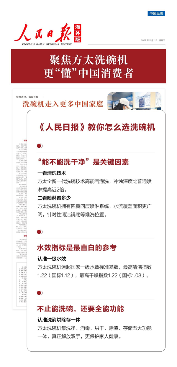报道中,《人民日报》通过多位消费者的现身说法和业内人士的专业解析,总结出挑选洗碗机的三个标准,以及方太为代表的国产洗碗机品牌在产品上相对应的诸多优势。