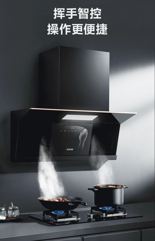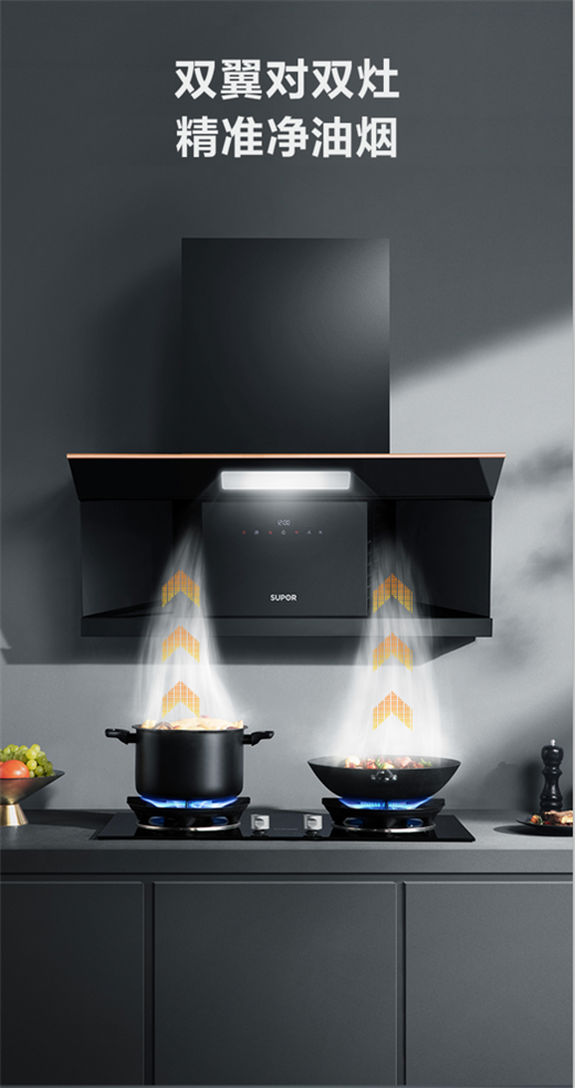 在中国的烹饪习惯中,往往喜欢一边炒菜,一边煲汤,双灶同时工作,面对双灶同时开火而产生的拢烟、吸烟需求,传统油烟机往往应对吃力,很容易产生油烟逸散。这些逸散的油烟又变成厨房难以忽视的痛点——附着在墙壁、家电上难以清理干净,进入人体易引发健康危害。