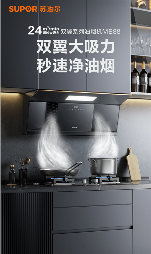 那在追求高品质生活体验的消费趋势下,“如何解决油烟问题,营造健康安全的厨房环境?”可谓是消费者最基础最核心的需求。苏泊尔全新双翼油烟机ME88,正是为了满足这一需求而生。作为苏泊尔引领高端智能厨电的一款创新智能烟机,ME88重新定义厨房新“净”界。