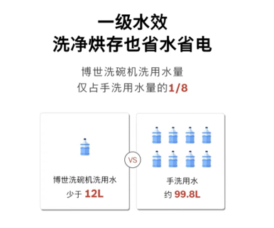 博世家电积极响应国家倡导的绿色发展理念,致力研发绿色节能产品。其最新推出的博世·4系3重盾护洗碗机就拥有一级水效认证,以洗涤12套标准餐具为例,手洗用水量约为99.8L1,而博世洗碗机在节能洗程序下清洗餐具所使用的总用水量少于12L,仅占手洗用水量的1/8。此外,博世洗碗机在省电方面也有着出色的表现,产品一年所节省的电量可供一个25W灯泡正常工作约2774小时,能有效减少居家用电。