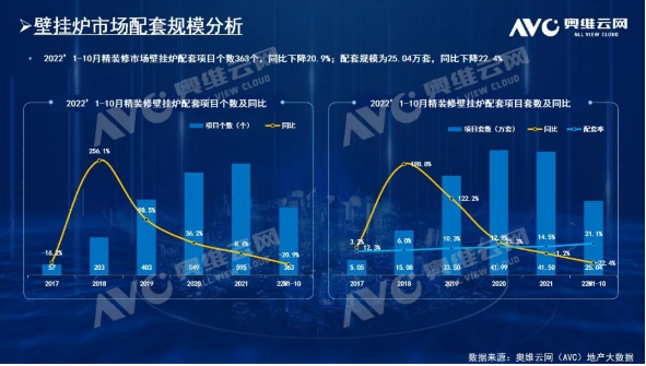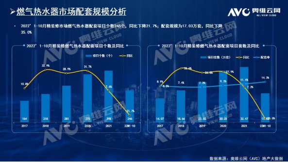 壁挂炉:因其采暖便捷,健康舒适的优势,成为很多没有集中供暖地区的首选,2022年1-10月精装修市场壁挂炉配套规模仍为热水器TOP1产品,规模达25.0万套,配置率高达21.1%,且同比上升6.9个百分点;从品牌竞争角度来看,2022年1-10月精装修壁挂炉市场TOP5品牌分别为威能、博世、菲斯曼、阿里斯顿、港华紫荆,市场份额合计为81.7%,同比下降2.3%,品牌集中度略有松散;从开发商阵营分析,2022年1-10月精装修壁挂炉配套规模TOP开发商中,龙湖地产高居榜首,规模超1.5万套,华润置地次之,持续关注。