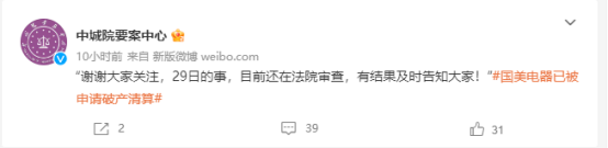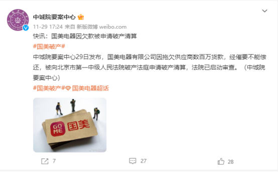 起因是11月29日,微博认证为“中城百亿产业研究院要案研究中心”的微博号“中城院要案中心”发布信息称:国美电器有限公司因拖欠供应商数百万货款,经催要不能偿还,被向北京市第一中级人民法院破产法庭申请破产清算,法院已启动审查。