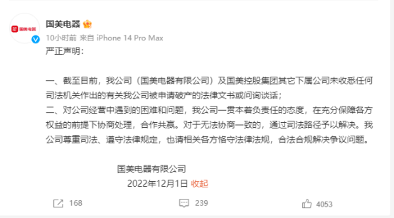 网上一位法律界专业人士认为:“目前网上也有关于国美拖欠供应商款项的消息,被申请破产清算一事最终是否得到法院受理,还需等待进一步消息,一般会在15日内。同时,被申请人也有对破产申请提出异议的权利。”