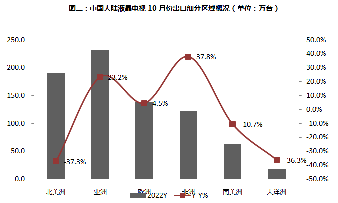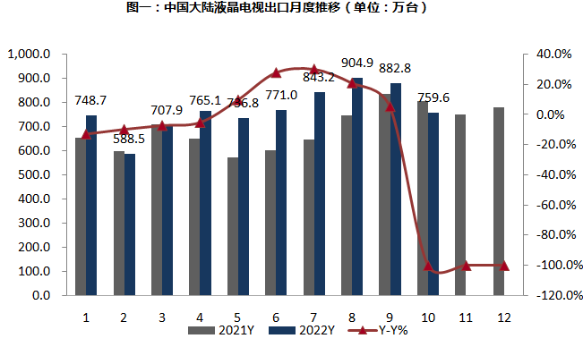 产业在线数据显示:2022年10月彩电产量1203万台,同比下滑4.5%,销量1188万台,同比下滑4.7%;其中出口760万台,内销428万台,分别同比去年下滑5.8%、2.7%。从累计情况来看,内销出货3123万台,同比下滑1.3%;出口7694万台,同比增长12.7%。内销市场在本月创今年出货新高,但是由于持续低迷的市场需求,即使在有降价加持的双十一大促下,出货仍未超去年同期;出口市场在去年高基数以及前期迅猛出货的影响下,近期出口进入下行通道,同比环比双双下滑。