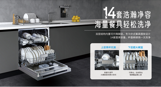 蓝炬星14套嵌入式洗碗机,双层结构内置可升降碗篮,专为中式餐具摆放设计,洗净高锅无压力,轻松解决饭后餐具清洁问题。