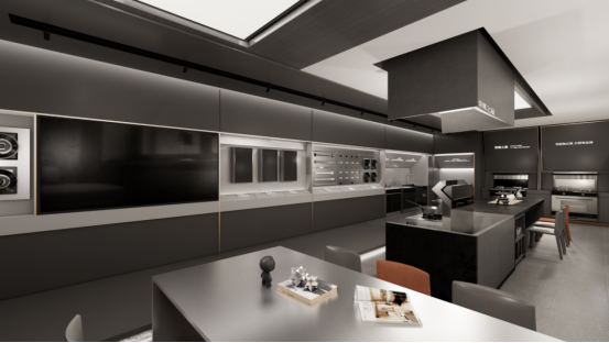 首先,门店外观门头和装饰部分在沿用金帝品牌特有的金色之外,大面积采用时下流行的高级灰配色,彰显定制集成厨电应有的格调与气质,形成一目了然的品牌辨识度;其次,在门店内部采用策展思维,通过整体沉稳的空间色调展现中性成熟感,并辅之空间调性的灯光氛围和家具照明,渲染宇宙天文的悬浮感,契合金帝航天IP,且能营造出高级的高定感;同时,保证区域空间开阔简洁,保证舒适感,让进店消费者消除陌生感,感受身临其境的厨居场景,实现沉浸式消费体验。