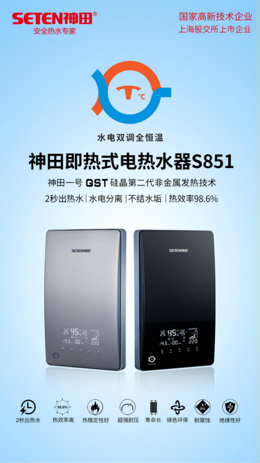 神田在即热式电热水器品类中拥有专利技术——神田一号QST硅晶第二代非金属发热技术,水电分离,不结水垢,热启动快,2秒出热水,热效率高达98.6%。凭借物理材料与结构上的优越特性,神田硅晶发热技术的即热式电热水器安全性更高,在水质差的地区也能正常使用。