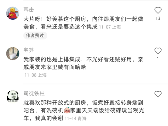 这些用户自发参与的讨论,既说出了自己对于厨房的困扰,也反映了人们对于高品质厨房颜值、社交、功能等全方位的需求,而这恰恰是方太开敞厨房所能解决的痛点。于是,围绕「生活的万种想象」这一话题展开讨论,让平台用户的注意力集中到了方太开敞厨房的身上,也由此为品牌营造了专属的沟通场域。