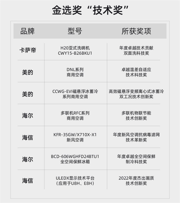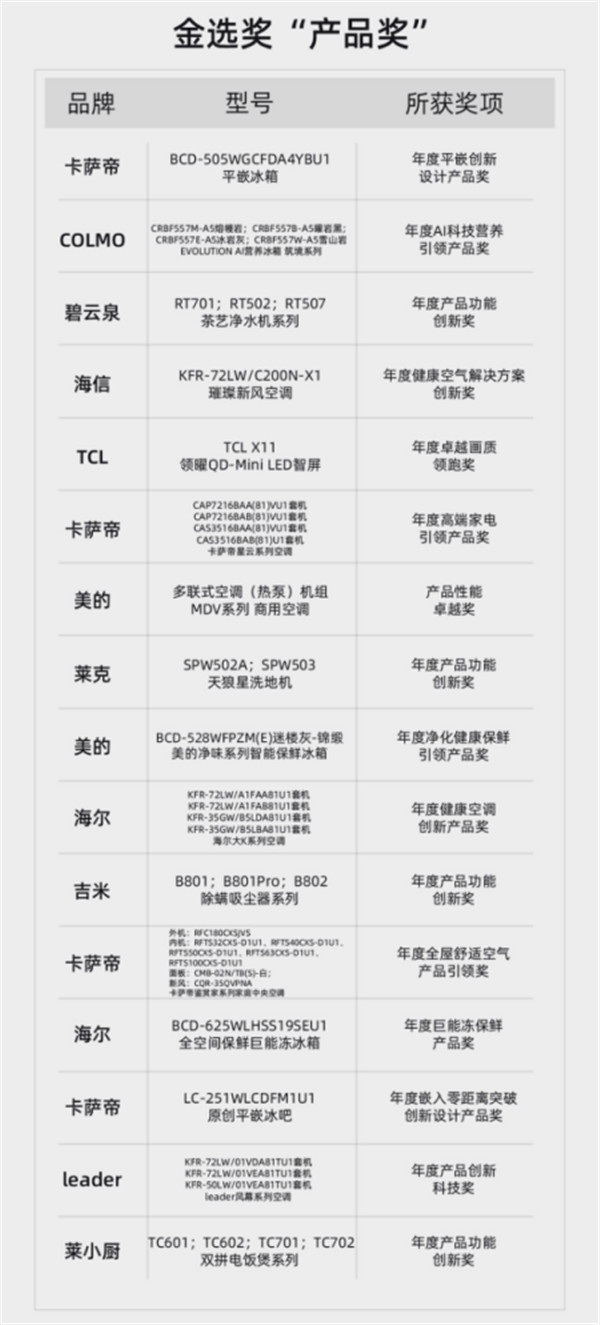 本次荣获“金选奖”的品牌主要有卡萨帝、美的、海信、TCL、海尔、莱克、COLMO、碧云泉、Leader、吉米、莱小厨,产品涵盖冰箱、电视、空调、中央空调、净水机、洗碗机、洗地机、除螨仪、电饭煲等各大科技品类。(具体产品型号见文末附表)。