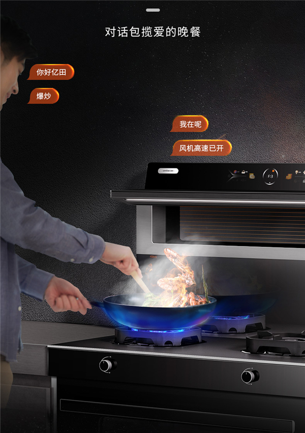亿田集成科技,研发定制天猫精灵与专属品牌AI智能语音。不仅可以实时通过“你好亿田,打开风机”等人机交互对话,选择烹饪模式、操控厨房厨电各项功能集成;更可通过6.8寸智能彩屏播放音乐、新闻等娱乐方式,为家居空间注入新的灵魂。在烹饪家庭美好的同时,赋予一个充分开放的全新场域。