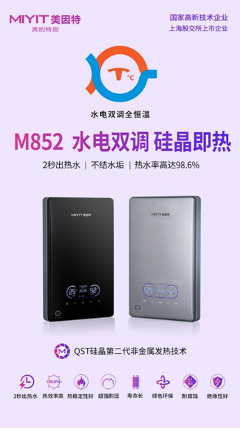 李卫泽介绍,M852采用了QST硅晶加热技术+水电双调全恒温技术的高端组合,产品差异化优势明显。水电双调全恒温技术提升了恒温功能与技术,QST硅晶非金属发热技术则因为水电分离、不结水垢、2秒出热水的综合优势明显优异于铸铝发热技术。