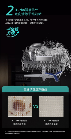 在智能洗净方面,该款新品全新搭载iTurbo智能洗技术和专利智投放系统,更精准、更高效完成全域洁净。一方面,在原有的精准涡流洗系统上加装iTurbo智能洗,双驱同步运作精准清除顽垢。精准涡流洗以46000PA超强水压和360°旋转的水流强效清洁不规则餐具,而在新配置的iTurbo智能洗系统下,形似三叉戟的喷淋臂装置能在不额外消耗水量的前提下集中4倍水流精准冲刷特定区域,强力去除油垢。另一方面,凭借着专利智投放系统的精准投放算法,新品既能保证洗涤剂的充分溶解以发挥强效去污力,又不会造成资源浪费,充分展现出西门子家电的可持续发展理念。专业洗涤程序也进一步升级成“8+6+3”种模式,满足用户更多个性化洗涤需求。