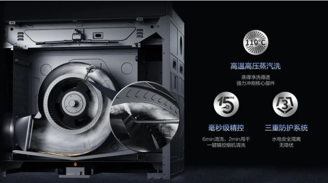 性能再好的油烟机也需要定期拆洗,使其能够一直保持原有吸力。但是美的蒸汽洗集成灶J30就不用这么麻烦。在烹饪结束后,选择灭菌蒸汽洗功能,就能够通过110℃的高温蒸汽,强力冲刷核心部件,去除顽固油污,杀灭细菌。而且只要手指一点就可以启动,无需拆洗,8分钟就能洗净油烟机内部,使其保持持久大吸力,简单又轻松。
