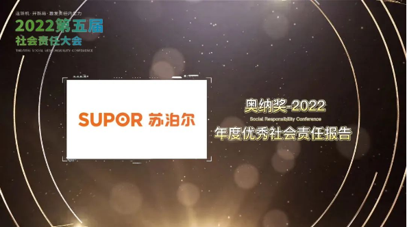 12月21日,第五届社会责任大会在北京举办,本次大会以“逢新机开新局激发责任内生力”为主题,与现场嘉宾展开跨领域交流。大会特别设置了奥纳奖颁奖典礼,奥纳取意“Honour”,意为“荣誉、尊敬、光荣”,旨在通过此颁奖礼,向众多责任担当者、公益实践者致敬。作为持续投入、躬身践行社会责任的家居生活品牌,苏泊尔在本次颁奖典礼上,荣获“2022年度优秀社会责任报告奖”。