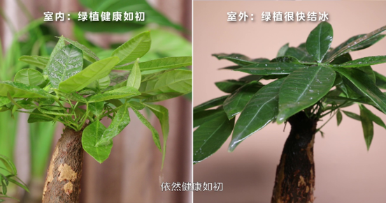 在凌晨12点,室内外温度都下降了不少,虽然有一墙之隔,但室内温度已低至-20℃。为了更直观的看到室内外温度情况的对比,我们在室内通过放置绿植并喷水的方式来观察其状态变化。