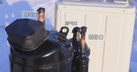美的工程师给了我们一个小技巧:“看端口”。普通压缩机只有排气口和回气口两个端口,而喷气增焓压缩机会多一个喷焓口。相比采用非喷气增焓压缩机的低压侧补气增焓技术,喷气增焓压缩机通过对压缩机中压腔进行补气,实现准二级压缩,进一步提高制热能力。