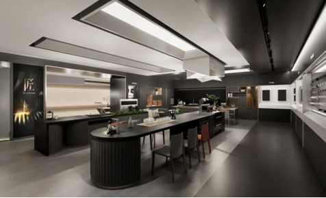其次是,全新的门店门头挑高,空间宽敞,还特别配置了打卡点/设计师角,供设计师/消费者参观鉴赏、社交分享,顺应时代消费潮流趋势,增加与品牌产生的互动;另外还有模块化定制区域、高级定制区域、整体厨房区域以及集中展示区域为消费者感受产品魅力提供更多的方案,这些对于产品的丰富呈现、现场布置、动线安排为消费者带来了更为良好的体验感。