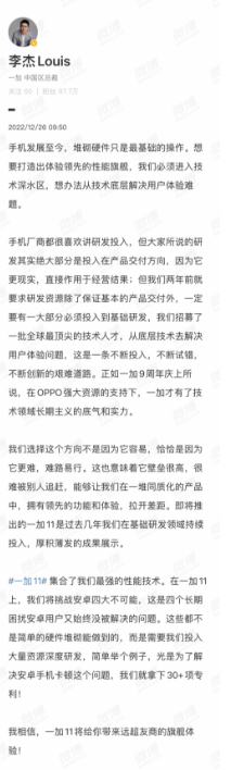 一加11作为一加全新战略布局下的首款旗舰产品,也是一加要“做好产品”的最新诠释。此前周年庆上,一加宣布了一系列新举措:OPPO将开启“护航计划”,未来三年为一加单独投入100亿,主要用于产品研发。为此一加未来核心将是做好产品,即极致性能、质感设计、以及真正的旗舰体验。为做好产品一加可以不惜成本,未来三年内硬件综合净利润率可以为0。即将发布的一加11将秉承上述产品理念,展现一加过去几年来在基础研发领域厚积薄发的成果,挑战安卓四大不可能。