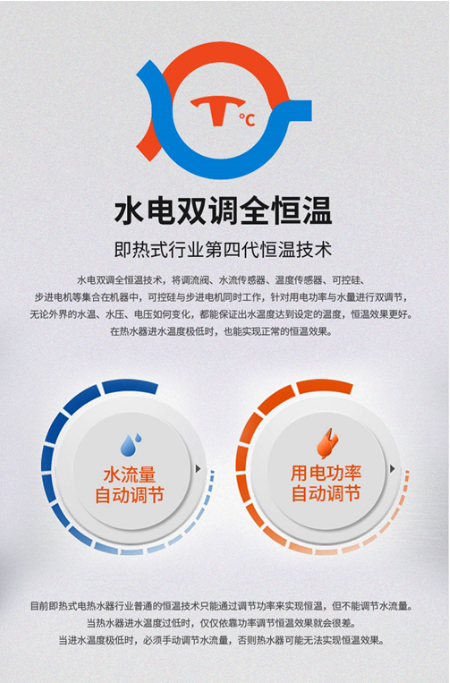 水电双调全恒温技术,将调流阀、水流传感器、温度传感器、可控硅、步进电机等集合在机器中,针对用电功率与水量进行自动双调节,无论外界的水温、水压、电压如何变化,都能保证出水温度达到设定的温度,恒温效果更好。