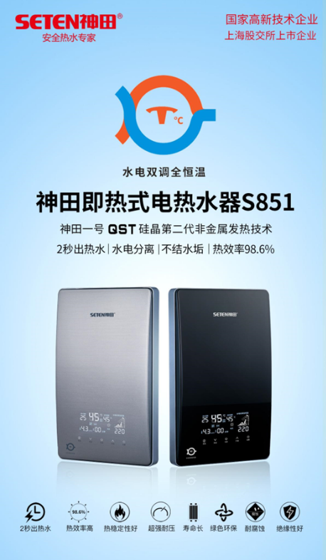 2022年7月,水电双调全恒温S851全新上市。851采用了“双芯双核硅晶加热+水电双调全恒温+溜背式亚克力面板+超大屏幕显示”的设计理念,产品竞争力远超目前行业内普通的即热产品。S851的诞生类似于苹果手机iPhone 4进入中国市场,iPhone 4让智能手机开始普及,S851将会引领行业普及水电双调全恒温技术。