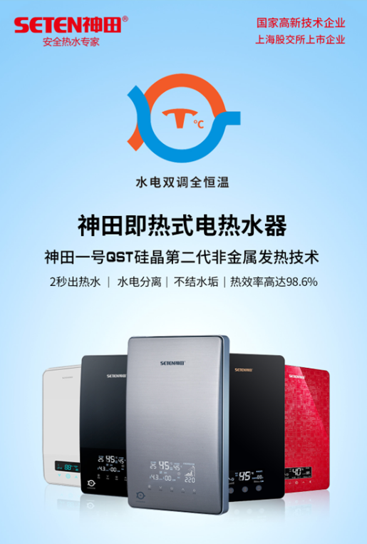 2012年,神田开发出高端即热式产品QST-K8,应用了水电双调全恒温技术,是行业内较早应用水电双调全恒温技术的产品;K8的面板采用了德国进口IMD模内覆膜工艺技术面板,也是行业较早应用这种新工艺材料的产品。