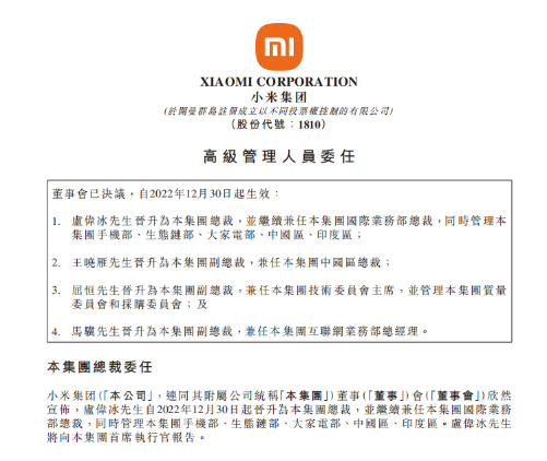 屈恒先生,41岁,自2010年加入本集团,是本集团初创团队成员之一,先后负责MIUI、米聊的软件开发、路由器系统工程师等工作,2018年任职本集团生态链部总经理。在此之前,屈恒先生拥有多年的软件开发工作经验,曾于北京金山软件有限公司任职。屈恒先生于2003年毕业于北京航空航天大学计算机科学与工程系,于2013年取得哈尔滨工业大学计算机科学与工程学硕士学位。