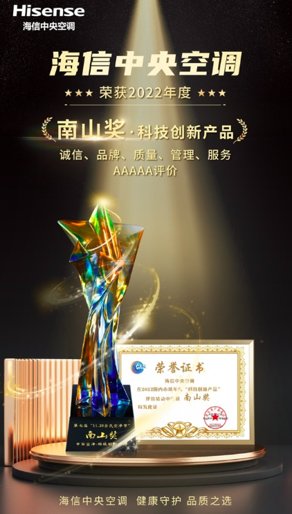在此方面,海信中央空调一直专注于为守护国民健康呼吸和美好生活带来空气解决方案,不断斩获来自市场消费者与行业的认可。12月28日,凭借在室内空净领域的技术创新和健康净化能力,海信中央空调获得“南山奖”的认可,再度荣登“南山奖”榜单。值得一提的是,这已是海信中央空调三度荣获“南山奖”,以硬核实力印证国货之光名副其实。