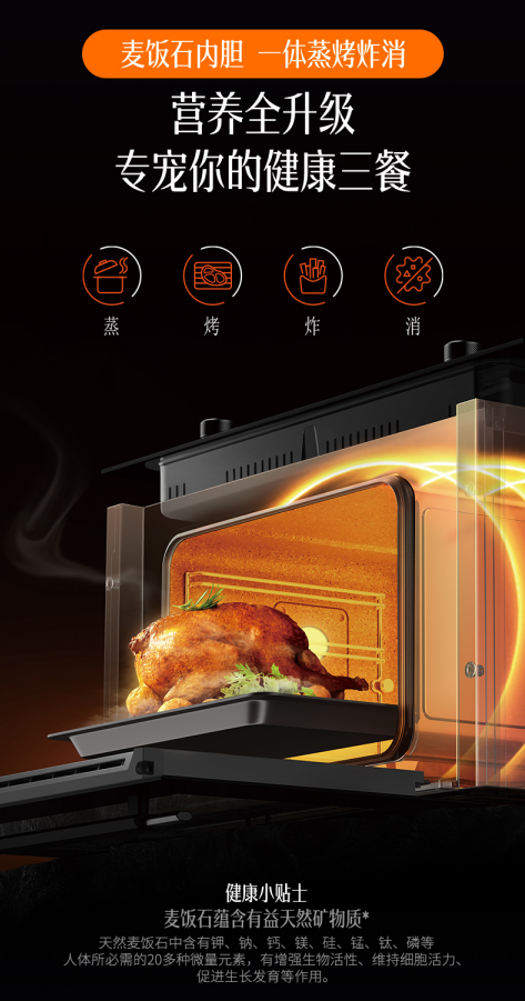 麦饭石蒸烤炸消内胆,由内而外赋能烹饪健康。不仅可使食材更添本味鲜美,而且有助于获取身体日常所需营养。健康,触手可得。