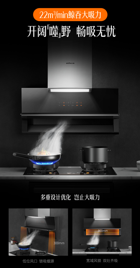 有亿田,无油烟,亿田始终践行。22m3/min大吸力,风口与炉灶之间仅为300mm加上P3ZK外置890mm超宽域吸烟风道,双灶齐吸,牢牢锁住油烟,直吸直排,顺畅无阻,油烟去无踪!