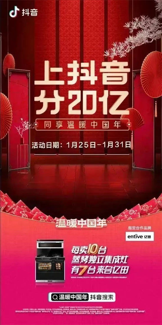 漫漫回家路,亿田与你同行!亿田集成灶携手抖音官方平台重磅开启“挑战亿田干饭虎,上抖音分20亿”活动。开启虎年好运!共度温暖中国年!