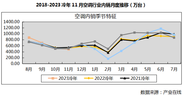 2023冷年累计家用空调生产4150.70万台,同比下降2.23%,销售4040.05万台,同比增长0.93%,其中内销出货2565.82万台,同比增长4.82%,出口1474.23万台,同比下降5.19%。