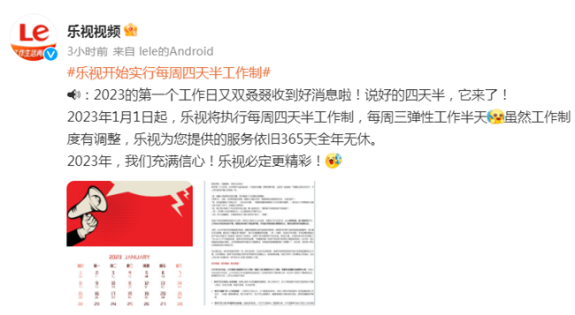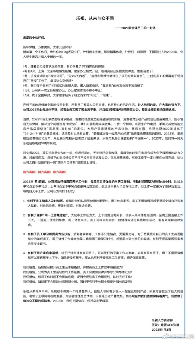 CEO张巍1月3日发布内部信称,自2023年1月1日起,公司将执行每周四天半工作制,每周三实行弹性的半天工作制,考勤时间调整为连续的5小时。