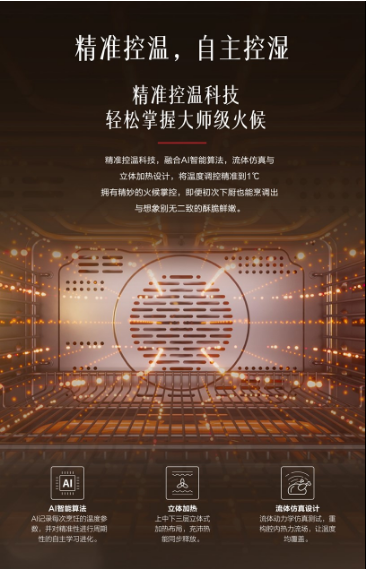 方太蒸烤烹饪机创新采用了温湿双控科技,通过精准控温科技和自主控湿系统,为用户提供更专业的蒸烤烹饪解决方案,是更高端的蒸烤一体机。其中,精准控温科技不仅搭载了方太蒸烤AI智能算法,通过周期性学习迭代,使蒸烤箱腔内控温更加精准,实现1度1调;而且还可实现上中下立体加热布局,让加热更加均衡;并通过流体仿真设计学,让热风均匀循环,平衡腔内温度,同层同温均匀烘烤效果更出色。