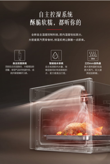 “蒸”和“烤”是中国菜烹饪常用的手法,因烹制出的食物鲜嫩弹滑、外酥里脆而受到广大中国家庭的喜爱,蒸烤一体机也在此背景下逐渐在现代家庭中普及。然而,目前传统的蒸烤一体机仍存在“蒸烤强弱组合”的痛点有待解决。