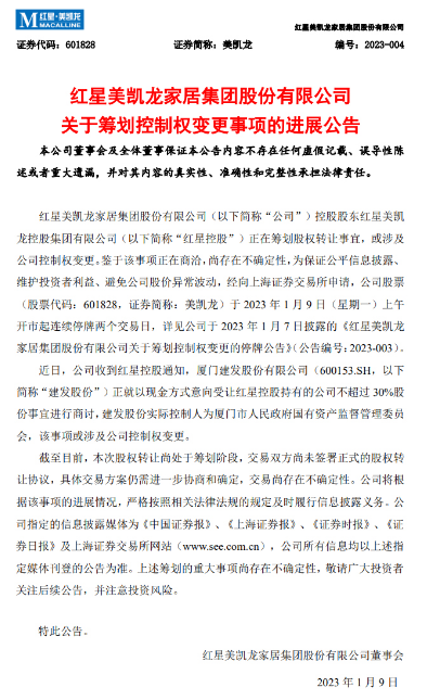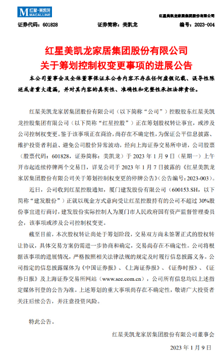 本次交易完成后,建发股份可能成为美凯龙控股股东。根据初步测算,本次交易预计可能将构成《上市公司重大资产重组管理办法》规定的重大资产重组。建发股份表示,具体收购比例尚需交易双方进行进一步的协商和论证后确定。