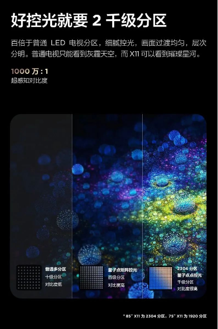 作为TCL旗下的旗舰产品TCL领曜QD-Mini LED智屏X11,将极致的视觉体验感拉满,高达157%的色域范围搭配2000nit的峰值亮度,将H-K效应体现的淋漓尽致,在人眼感知亮度上表现堪称完美,给观看者带来了更畅快的感官刺激。更有QD-Mini LED技术加持,将量子点技术与Mini LED技术相结合,最高可达2304分区的量子点控光,精准实现像素级点控光,明暗之间,真实世界清晰可见,大到宇宙浩瀚,小到一颗尘埃,都能一览无余。