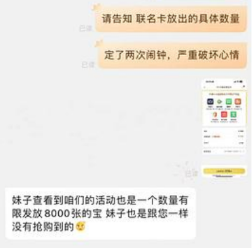同时在社交平台,有人晒出自己微信群中黄牛的截图,表示活动开始前就有系统漏洞,被黄牛利用强买链接买了,所以在第二天的活动中可能都不到8000个名额,普通用户只是在捡黄牛的“漏”而已。有用户对此向京东客服进行反馈,但从用户角度而言,京东并没有公开的作为,既没有补充京东“PLUS超级联名卡”名额,也没有对强买链接购置的黄牛进行处罚。