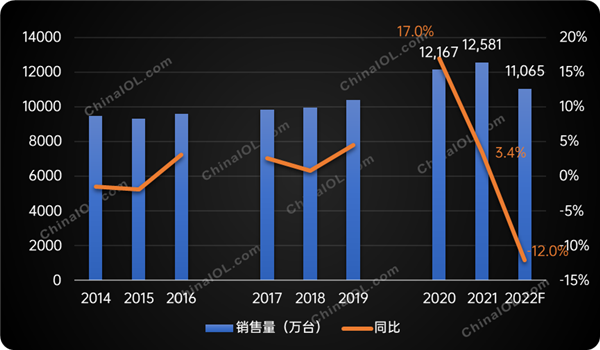 回顾2022年冰箱冷柜市场,尽管原材料价格冲高后回落,企业成本端压力有所缓解,但在国内市场活力减弱、海外产能陆续恢复以及上年的高基数效应下,产销量下滑明显。据产业在线预测,2022全年中国冰箱冷柜销售量为11065万台,同比下滑12%。