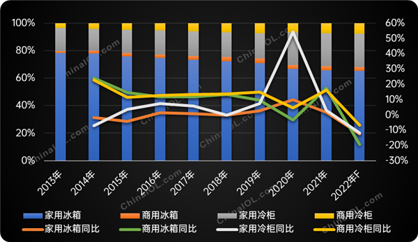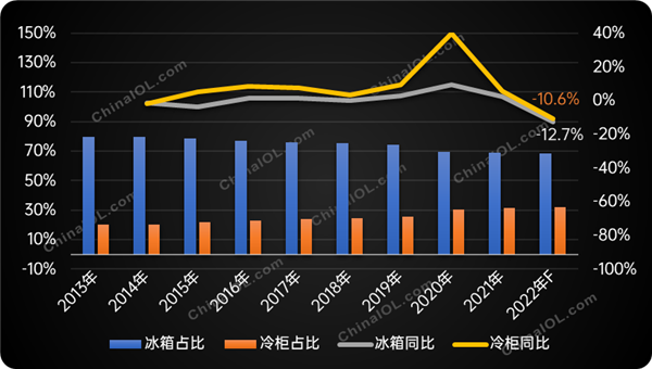 2013-2022年中国冰箱冷柜分产品占比及增长变化