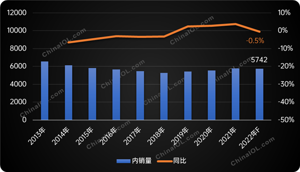 2022年,国内疫情反复不断、就业收入承压,消费信心不足对冰箱冷柜等家电消费增长带来较大影响,但随着国内多重消费刺激政策落地,内销市场逐步回温,产业在线预测数据显示,2022年冰箱冷柜内销量为5742万台,同比微降0.5%,与上年基本持平。