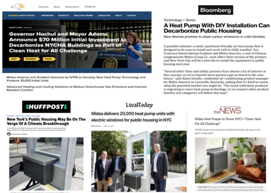 美联社、纽约电视台在内等多家主流国际媒体见证了该仪式;其中,Local Today在报道此次竞赛时表示:“美的作为高效热泵领域的全球领导者,已被确定为创新电气化解决方案的主要合作伙伴,其方案可以更好地满足现有多层住宅家庭的供暖和制冷需求,并加速从化石燃料的转型过渡。”